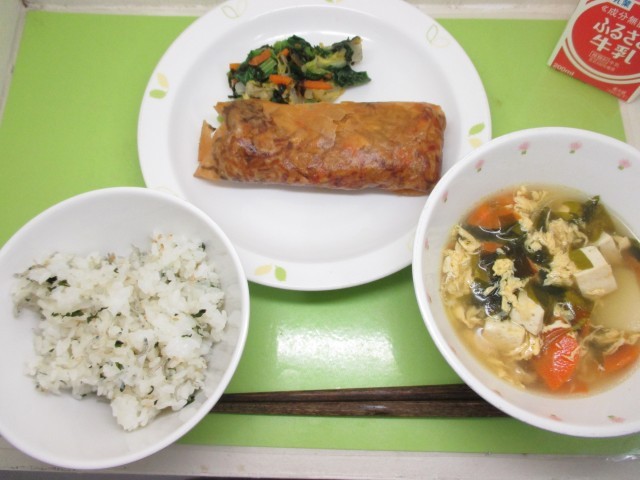 わかめとじゃこのごはん・牛乳・春巻き・小松菜と白菜ののりあえ・卵と豆腐のみそ汁