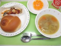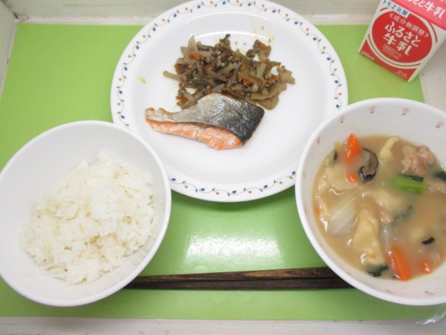 有機米ごはん・牛乳・魚の塩焼き(鮭)・五目きんぴら・すいとん