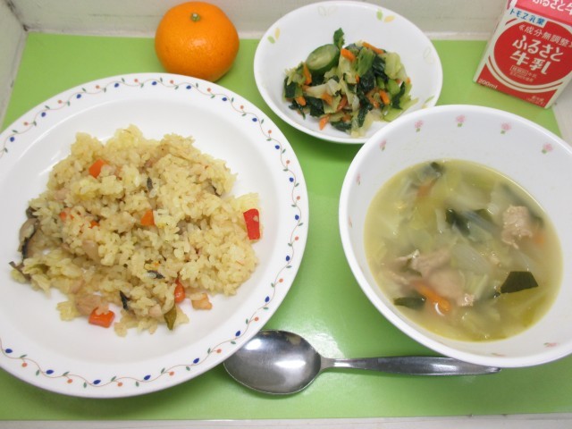 パエリア・牛乳・小松菜サラダ・レンズ豆と野菜のスープ・くだもの(みかん)
