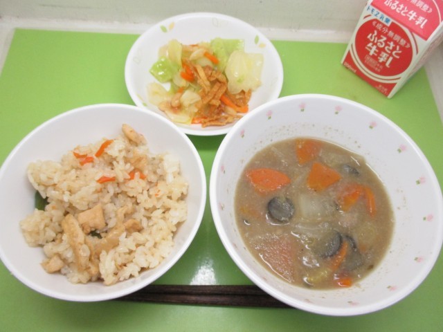 こぎつねごはん・牛乳・いわしのつみれ汁・カリカリ豆サラダ