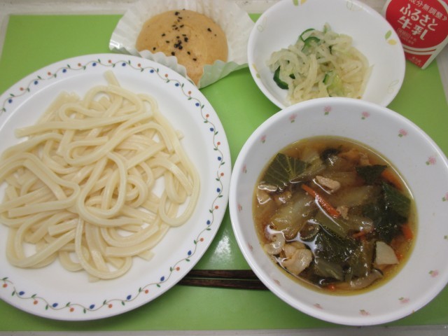 ちゃんこうどん・牛乳・きゅうりと大根のごま風味・黒糖入りむしパン