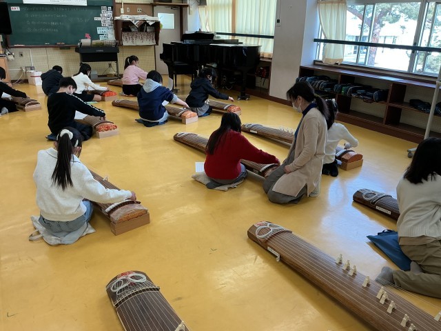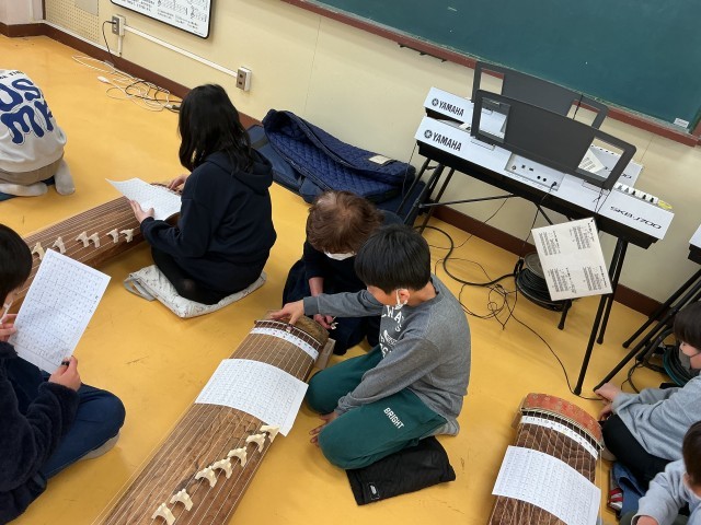 地域の方を講師にお招きし、5年生がお箏の学習をしました。きちんと正座をして奏でます。