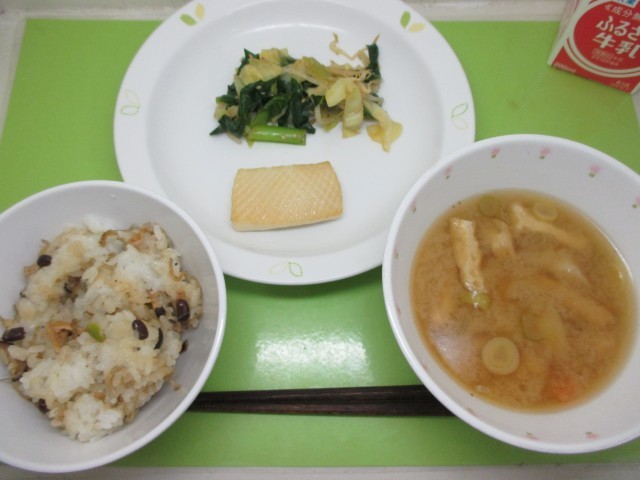 まめまめおこわ・牛乳・いかの照り焼き・野菜サラダ・みそ汁