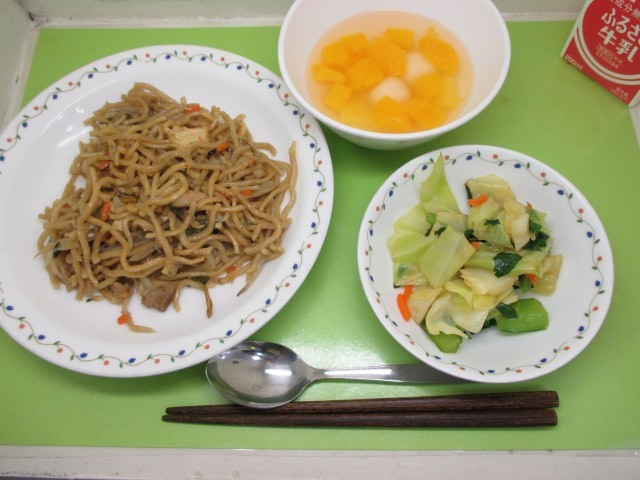 パッタイ風焼きそば・牛乳・キャベツと小松菜のサラダ・フルーツ白玉