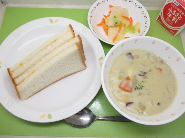 ジャムサンド(マーマレード)・牛乳・たらと冬野菜のシチュー・白菜のサラダ