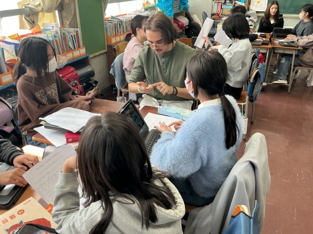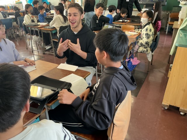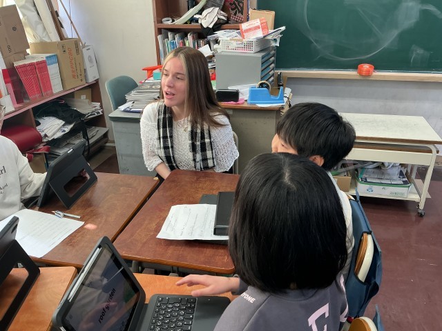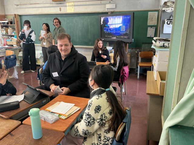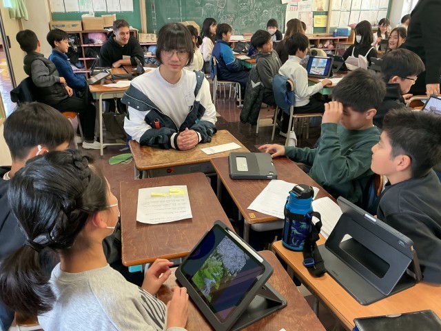 テンプル大学日本校の7名の学生さんたちが英語の授業を行いました。少人数の班に分かれ、児童が調べたことを英語で説明をします。知り合いのお兄さんお姉さんと日常会話を楽しんでいるかのように始終和やかな時間が流れました。通常の英語の授業が生かされた瞬間でした。