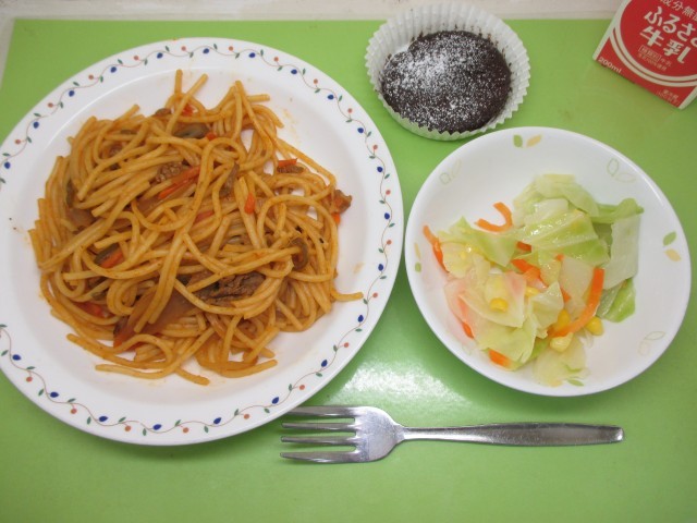 スパゲティナポリタン・牛乳・コーンサラダ・ガトーショコラ