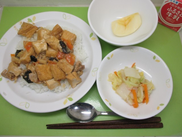 家常豆腐丼・牛乳・辣白菜・果物(りんご)
