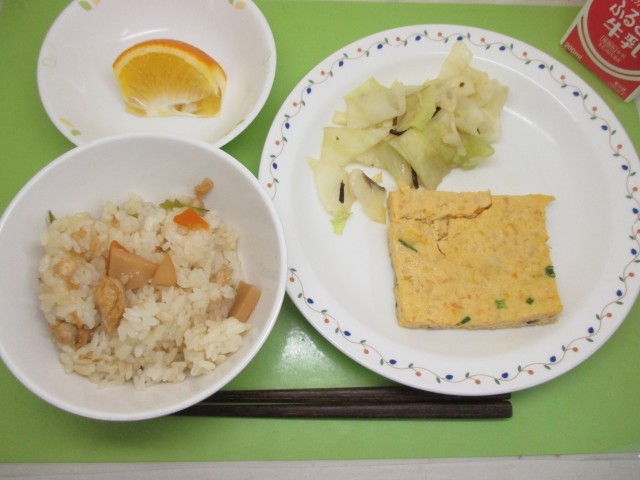 たけのこごはん・牛乳・千草焼き・キャベツの塩昆布かけ・くだもの(甘夏)