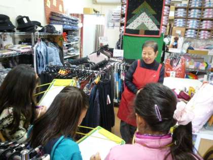午後、3年生がクラスごとに時間差をつけて、等々力商店街の12店舗の協力を得て、3人グループになって、1グループが1店舗を訪問し、自分たちの質問事項を尋ねるという学習を行いました。