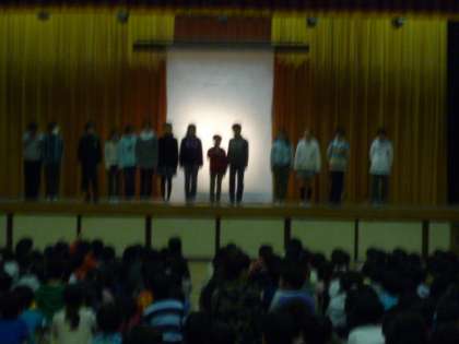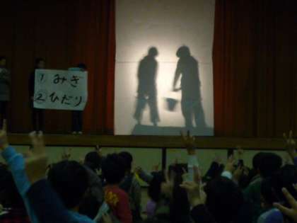 児童集会で、集会委員会がシルエットクイズで全校の子どもたちを楽しませました。体育館のステージに映し出されるシルエットに対してクイズを出し、どちらかを答えるクイズです。写真の右と左、どちらのバケツに水が入っているかという問題などでした。