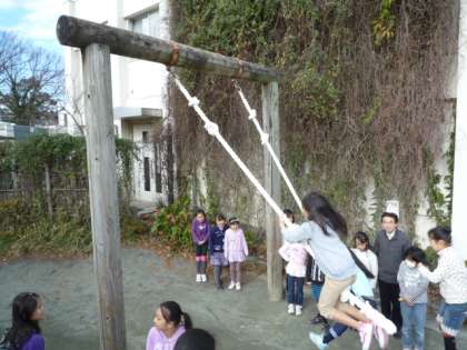 長い間使っていたターザンロープのロープが摩耗して切れそうになったので、11月末から修理を依頼していました。そして、昨日工事をしてロープを付け替えし、いよいよ、今朝から新しいロープで遊ぶことができるようになりました。4年生以上の女の子が、とても喜んでくれました。