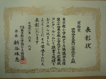 玉川小PTA広報委員会の広報誌が、東京都小学校PTA協議会から「奨励賞」という栄誉を受けました。今までの広報委員会の地道な、でも温かい広報活動が東京都で表彰されたということは、本当におめでとうございます。この栄誉はきっと今年の委員の方々にも励みになることと思います。本年度もよろしくお願いいたします。