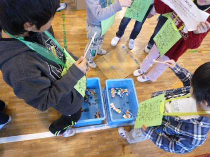 今日の1,2時間目、日ごろ玉小タイムでお世話になっている4年生を体育館に招いて、2年生たちがゲーム遊びを一緒に行いました。2年生は、先生のアイデアではなく、自分たちで考えた進行の仕方や遊びの方法を、12月のはじめごろから一生懸命考えて、実行委員の人たちは、朝7時半くらいには学校に集まって、相談してきました。