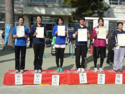 新春マラソン大会には、学校から7人の先生方が参加して、がんばってくれました。一班男子の部は、レベルが高くて、男の先生方も善戦しましたが、入賞はなりませんでした。一般女子の部では、原先生と植村先生が見事上位に食い込み表彰されました。