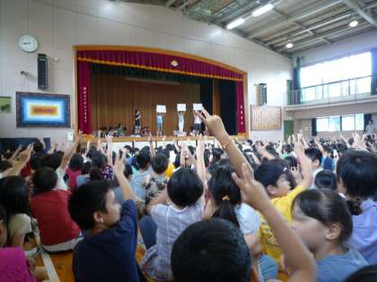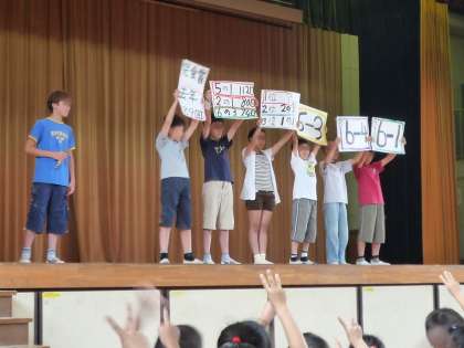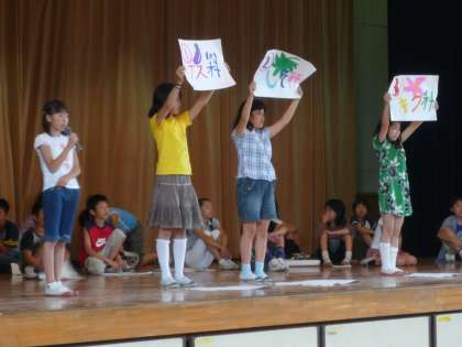 今日の集会では、給食委員会と栽培委員会の紹介がありました。給食委員会では、「残菜の少ない学級ベスト3は?」「食器を割っていない学級ベスト3は?」「後片付けの上手な学級ベスト3は?」と言ったユニークなでも興味のある問題を作って関心を持たせていました。栽培委員会でも、クイズ形式で委員会の活動内容を紹介してくれました。「学校で育てているゴウヤの産地は?」「コスモスはどの植物の仲間?」など、委員会で菜園に植えている野菜の紹介も兼ねながら楽しく紹介できました。