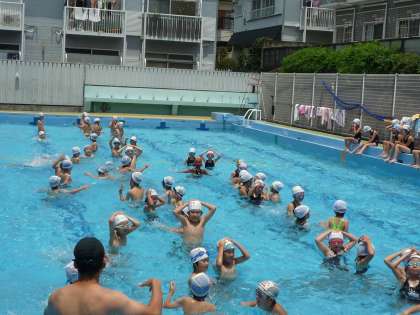 今日は、水温、気温ともOKで、2年生はわくわくしていたプールでの授業ができました。よかったですね。たくさんのフレンドシップのお母さんたちの手伝いをいただきながら、プール開きを行ないました。各学級の代表の人が2年生なりのそれぞれのめあてをしっかりみんなの前で発表し、事故がないように「よろしくお願いします。」とプールに礼をしました。水に入るのがとてもうれしそうでした。