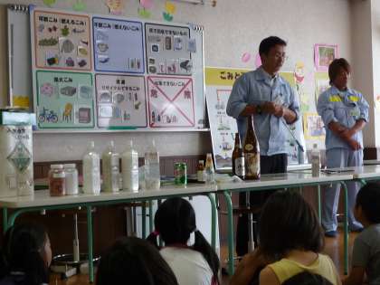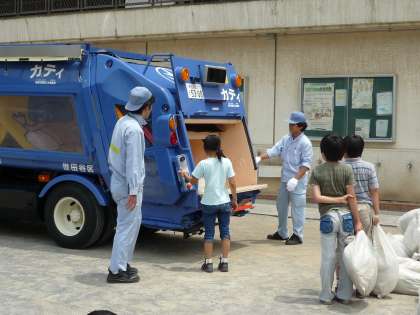 4年生は、清掃局の方々の協力を得て、ごみ問題についての勉強を体験も交えながら勉強をしました。特に、めったに見ることができないスケルトンのごみ清掃車をつかって、実際にゴミ袋を車に入れて動かす体験ができました。また、ランチルームでは、たくさん増え続けるごみ問題について、どのような努力が必要かについて清掃局の方々から資料を使って説明してもらいました。4年生はこの1週間の間、実際に家のごみを収集場所に運ぶお手伝いをしていますので、真剣に聞いている子が目立ちました。