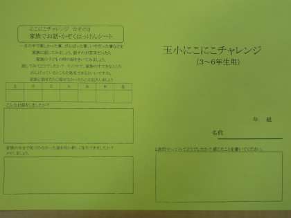 玉川小PTA研修委員会から、保護者の皆様に協力依頼していただいている「にこにこチャレンジ」も、いよいよ今日が最終日となりました。ご家庭で、子どもたちとのステキな1週間が過ごせたことと思います。今年は、写真の黄色いチャレンジシートの他に、保護者から子どもへのラブレターも書いていただくことになっています。