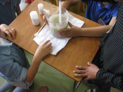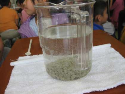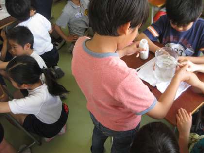 実験では、濁った水をきれいにしました。凝集剤を入れて、撹拌すると「おおーーー!!」という歓声が上がりました。見事にきれいな水になりました。