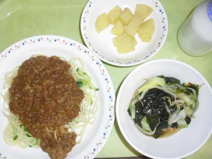 ジャージャー麺 牛乳 じゃがいものから揚げ わかめサラダ