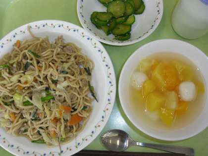 塩焼きそば 牛乳 きゅうりの中華味 フルーツ白玉