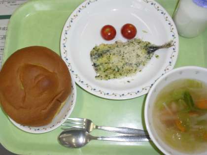 あしたばパン 牛乳 いわしのガーリック焼き チェリートマト レタススープ