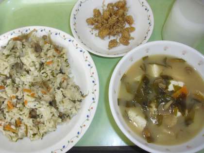 豚肉とごぼうのご飯 牛乳 味噌汁 大豆とじゃこの甘辛揚げ