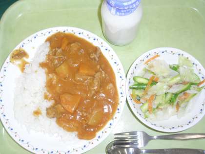 ハッシュドポークライス 牛乳 アスパラサラダ