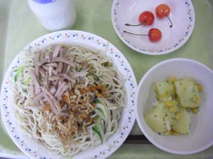 冷やし中華 牛乳 じゃがバタコーン さくらんぼ