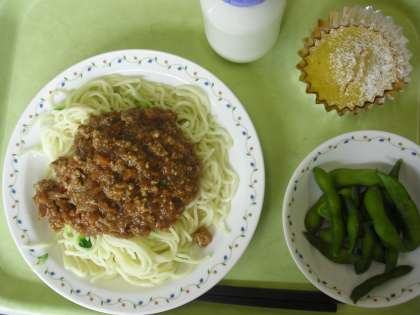 ジャージャー麺 牛乳 枝豆 かぼちゃのケーキ