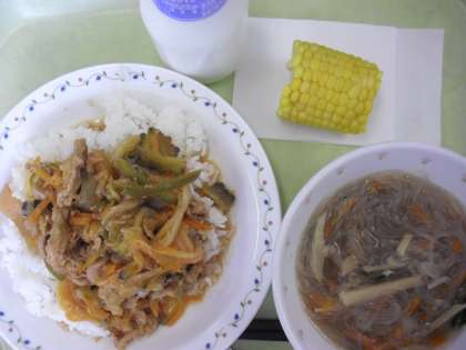 夏野菜の豚キムチ丼 牛乳 春雨スープ 蒸しとうもろこし
