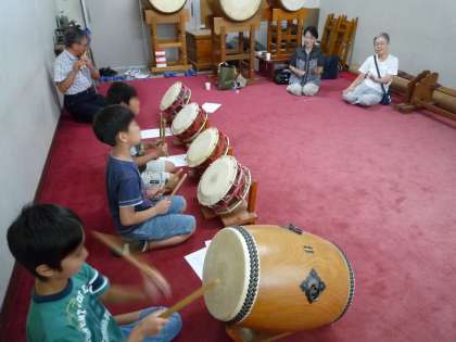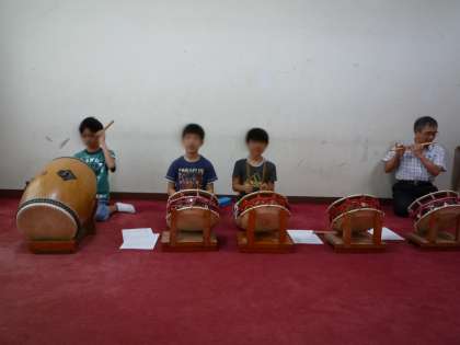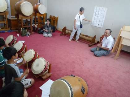この講座は、生徒がたったの3人ですが、講師の先生方が5人控えて、手とり足とり熱心に教えてくださいました。地域のお囃子連の方々で、とても学校では味わえない、温かい雰囲気の中で練習をしていました。生徒の子どもたちも、2人は今日が初めてだったのですが、とても和太鼓と占め太鼓のたたき方がうまくなったようです。叩いている音を聞いていただけないのが残念です。あと4日連続であります。きっと上達が早いでしょう。できたら、お祭りのときに山車の上に乗って演奏できるといいなと思いました。頑張ってください。