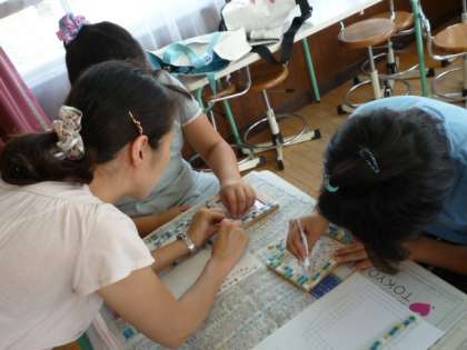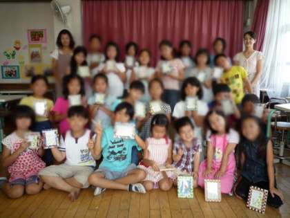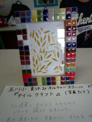 「タイルクラフト」は保護者の増山康子さんを講師に、子どもたちが21人集まって、楽しそうに行われました。20種類くらいのタイルの中から自分の気に入った色合わせを考えながら、写真立ての外枠をタイルで埋めていく作業は、子どもたちが興味を持って一生懸命取り組んでいました。それぞれがこだわりの色合わせがあるようで、とても素晴らしい出来ばえでした。最後に集合写真をとりました。