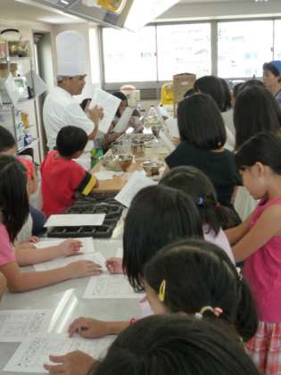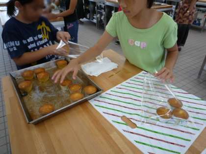 玉高から150メートルくらい玉堤のほうに行ったところにある「日本菓子専門学校」で「ケーキ作り」講座が開催されました。ここは、お菓子屋さんやパン屋さん、和菓子屋さんになりたい人が集まって勉強する学校で、日本にもここ1校しかないと聞いています。こんな場所で、28名の子どもたちが本格的な施設をお借りして、ここの先生方から作り方を教わって、オレンジケーキとアップルケーキを作る体験をさせてもらいました。ここで作るお菓子はおいしいと11月3日の文化祭には地域の多くの方が集まる有名な学校で、ケーキ作りができた子どもたちは、本当に幸せでした。遠藤校長先生をはじめ、三浦先生、始め先生方、本当にお世話になりました。ありがとうございました。