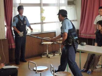 今日の午後、7ブロックの学校を代表して、本校で警察と合同の本格的な学校防犯訓練を実施いたしました。他校からも50名近くの教職員が集まった中で行われました。警察官が不審者役に扮して、迫真の演技で校舎に入って教室に侵入するという想定でした。教職員が役割を持って、子どもたちの安全を第1に、そのあと、どう対応するのかの訓練を行いました。そのあと、初期対応の仕方や犯人を取り押さえる時の器具の使い方などの研修を行い、有意義な研修をすることができました。