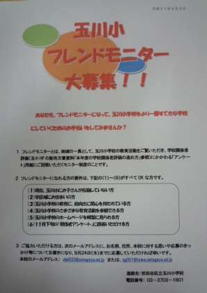 本年度から玉川小学校では、学校関係者評価の改善を図るために、「玉川小フレンドモニター」というモニター制度をつくりました。これは、地域に住んでいらっしゃる方で、現在子どもが玉川小学校に通っていない方を対象に、いくつかの要件を備えた方をモニターとして、「学校関係者アンケート」にご回答いただこうという制度です。詳しくは、トップページの配布文書「玉川小フレンドモニター募集」をご覧ください。あわせて、今日配布いたしました「21年度の学校関係者評価の進め方」もご覧ください。ご覧になられた方、ぜひ、お近くの適任の方に情報をお伝えください。ご協力お願いいたします。