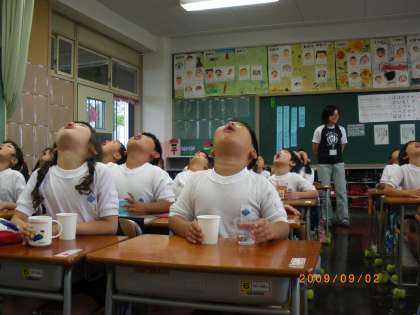 今日、1年1組と2組で、「すこやかタイム」を使って、養護の菊原先生と正しいうがいの仕方や手の洗い方、インフルエンザにかからないための注意などについてお勉強しました。実際にうがいでどんなところに気をつければ菌の侵入を防げるか、実習もしてみました。これから全教室で、このような「すこやかタイム」を実施し、インフルエンザの防止に努めてまいります。お家でもご協力お願いいたします。