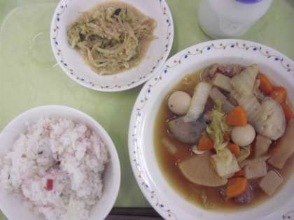 梅じゃこご飯 牛乳 豚肉と大根のうま煮 ごま酢かけ