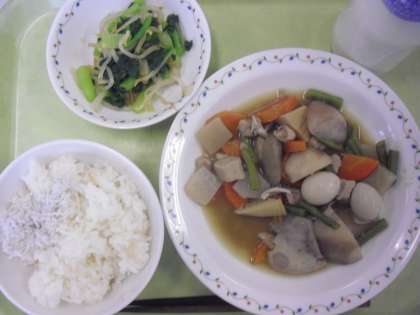 ご飯 しらす干し 牛乳 鶏肉と里芋のうま煮 野菜のからしじょうゆかけ