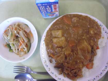 カレーライス 福神漬け 飲むヨーグルト こんにゃくサラダ