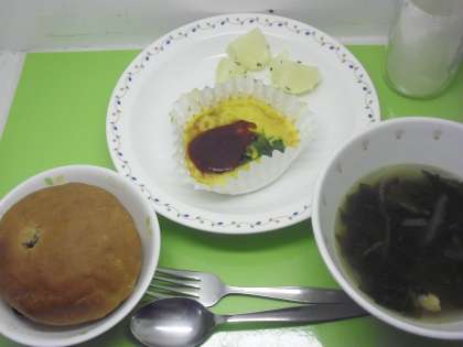 ぶどうパン 牛乳 チーズ入り卵焼き パセリポテト 洋風わかめスープ