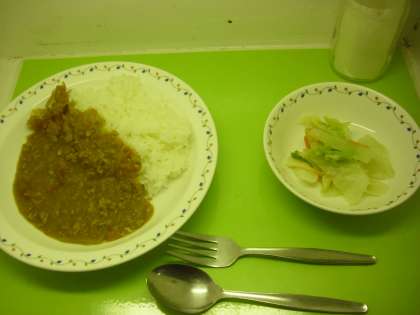 キーマカレーライス 牛乳 福神漬け キャベツサラダ