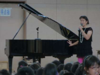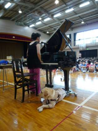 今日の3,4校時、体育館で全校対象の「ゆめコンサート」がありました。生まれた時から目が見えないながら大学で声楽を学んだ、大石亜矢子さんが、ソプラノ歌手としてピアノの弾き語りによる素晴らしい演奏をしてくださいました。アイメイト(盲導犬)のセロシアについても分かりやすく子どもたちにお話ししてくださいました。
