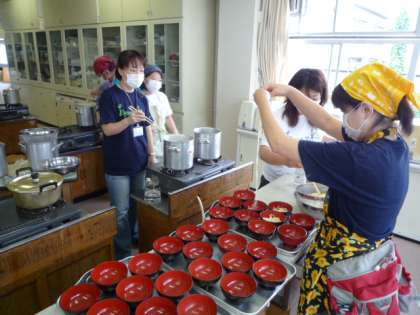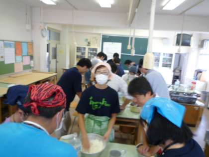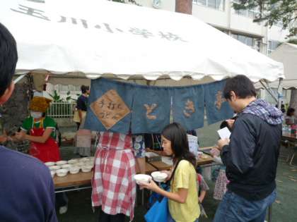 恒例の手打ち「とき亭」うどんは、10時からうどん玉作りに取り掛かり、12時30分から延ばし、切り、湯掻きの工程を教職員とおやじの会、PTA役員の方々でやり遂げました。バレー部の方々の助けもいただき、577食を売りさばきました。