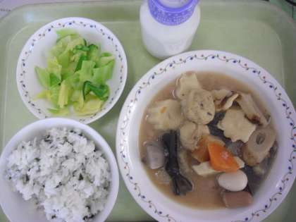 わかめご飯 牛乳 肉みそおでん 野菜のひとしお