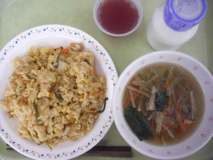豚キムチチャーハン 牛乳 春雨スープ ぶどうゼリー