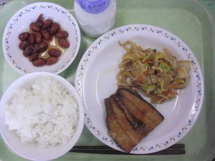 ご飯 さんまのかば焼き 野菜のからしじょうゆ和え 煮豆
