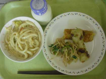 かきたまうどん 牛乳 ちくわの2色揚げ ごま酢和え