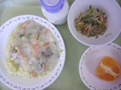 カレーピラフのクリームソースかけ 牛乳 こんにゃくサラダ はまさき